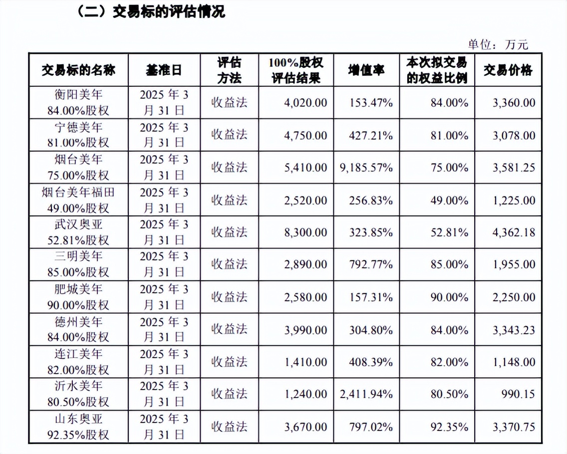 溢价收购遭问询。需要指出的是,美年健康本次收购均为高溢价收购,其中烟台美年、沂水美年、三明美年、山东奥亚的增值率分别高达9,185.57%、2,411.94%、792.77%、797.02%,对应权益的交易价格分别为3,581.25万元、990.15万元、1,955.00万元、3,370.75万元。