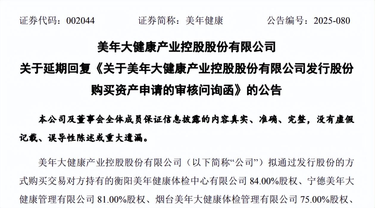 再次实施并购,超4亿元。2025年4月,美年健康再次抛出收购计划,拟通过发行股份方式收购衡阳美年84.00%股权、宁德美年81.00%股权、烟台美年75.00%股权、烟台美年福田49.00%股权、武汉奥亚52.81%股权、三明美年85.00%股权、肥城美年90.00%股权、南宁美元康69.86%股权、德州美年84.00%股权、安溪美年72.90%股权、连江美年82.00%股权、沂水美年80.50%股权、山东奥亚92.35%股权、厦门银城美年81.00%股权及控股子公司郑州美健47.37%少数股权、花都美年49.00%少数股权、安徽美欣42.46%少数股权、淄博美年49.00%少数股权、吉林昌邑美年48.05%少数股权。