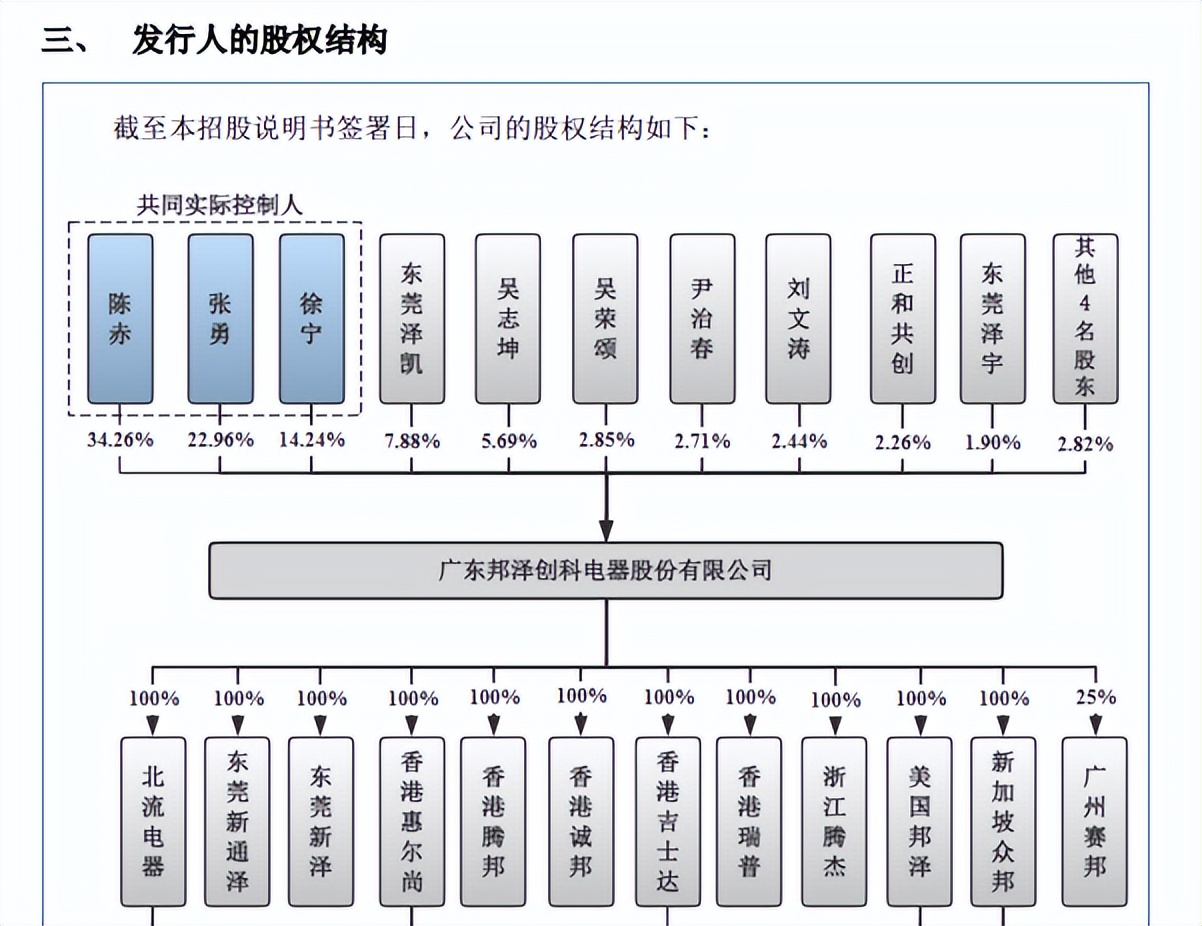 实控人表决权近73%,陈赤辞任董事。邦泽创科控股股东是陈赤,实际控制人是陈赤、张勇、徐宁,三人直接持股比例分别为34.26%、22.96%、14.24%,其中徐宁还通过东莞泽凯、东莞泽宇间接持有1.26%、0.11%的股份,合计持股比例15.61%,三人合计持股比例高达72.83%。