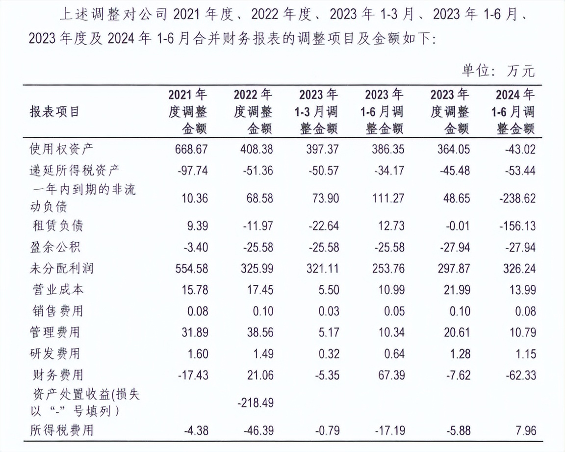 据短平快解读了解,邦泽创科对2021年、2022年、2023年1-3月、2023年1-6月、2023年、2024年1-6月因执行新租赁准则相关的使用权资产、租赁负债等科目核算不准确,导致相关资产、负债、权益以及损益等列报不规范的相关会计差错事项进行了调整,具体参考下图:
