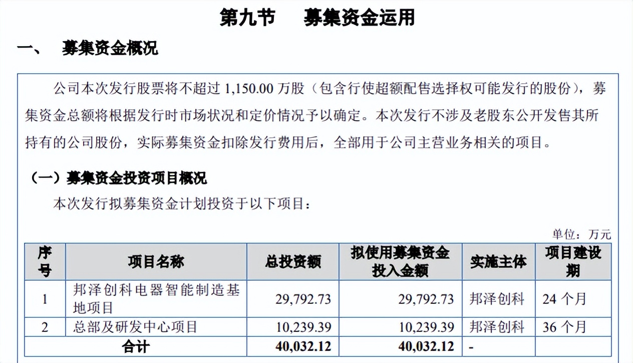 据短平快解读了解,本次IPO,邦泽创科拟公开发行不超过1,150.00万股,拟募集资金40,032.12万元,用于邦泽创科电器智能制造基地项目、总部及研发中心项目,拟投入募集资金分别为29,792.73万元、10,239.39万元。