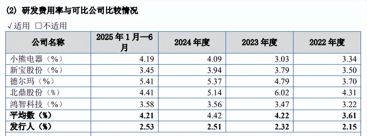 对比行业,可比同行研发费用率均值分别为3.61%、4.22%、4.44%、4.21%,均超过公司,具体来看,可比同行研发费用率均超过公司,以期末为例,小熊电器、新宝股份、德尔玛、北鼎股份、鸿智科技分别为4.19%、3.45%、5.41%、4.41%、3.58%。
