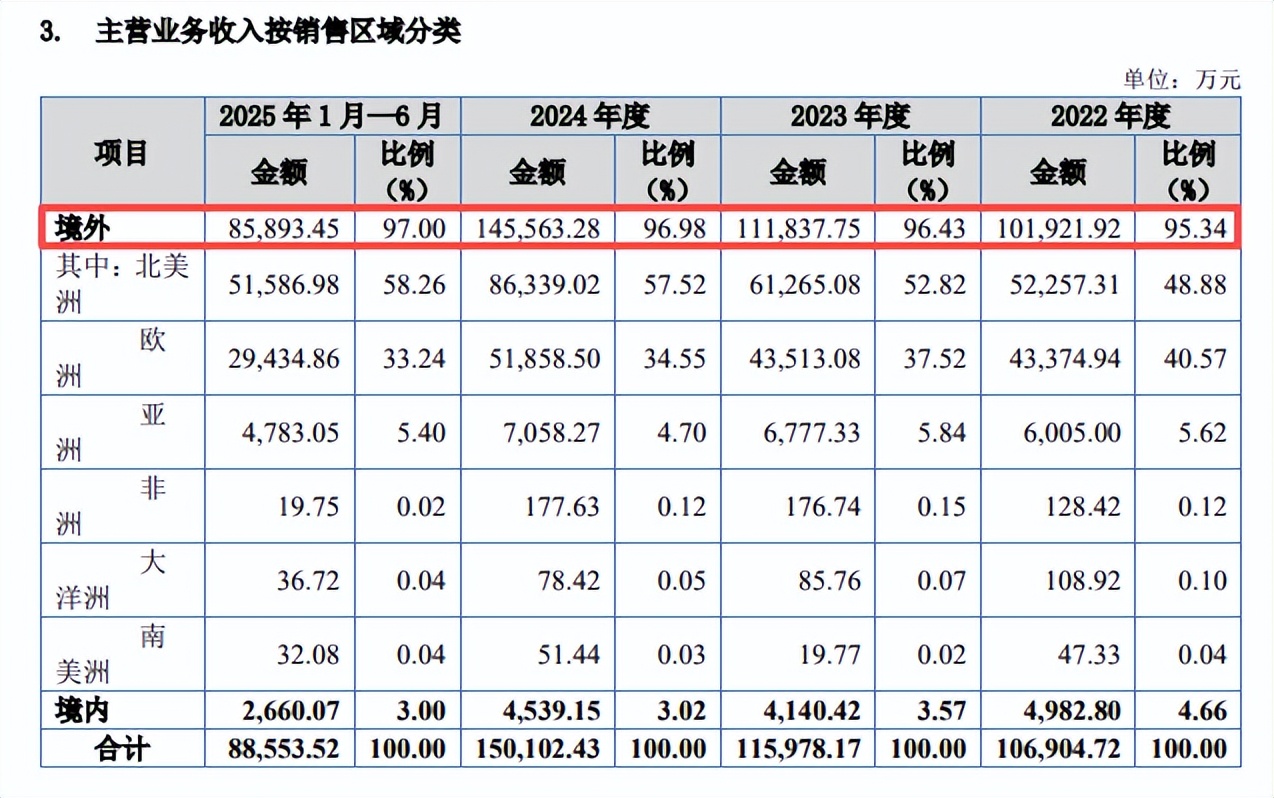 进一步来看,公司主要面向北美洲、欧洲市场,期末销售金额分别为5.16亿元、2.94亿元,占比分别为58.26%、33.24%,而境内收入仅2,660.07万元,占比仅3%。