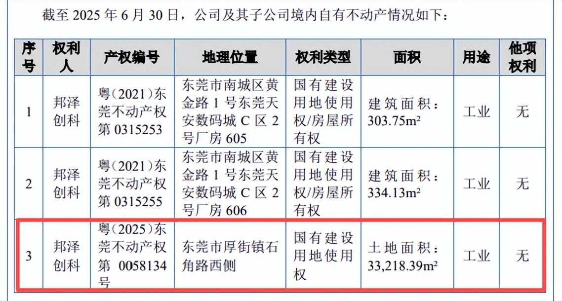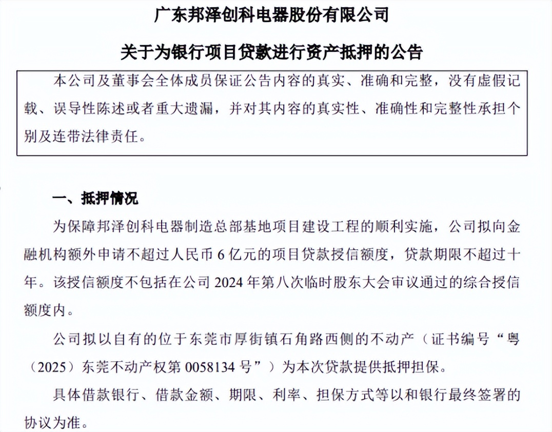 2025年8月,泽创科公告称为保障邦泽创科电器制造总部基地项目建设工程的顺利实施,拟向金融机构额外申请不超过人民币6亿元的项目贷款授信额度,贷款期限不超过十年。该贷款将以位于东莞市厚街镇石角路西侧的不动产(证书编号“粤(2025)东莞不动产权第0058134号”)作为抵押担保。