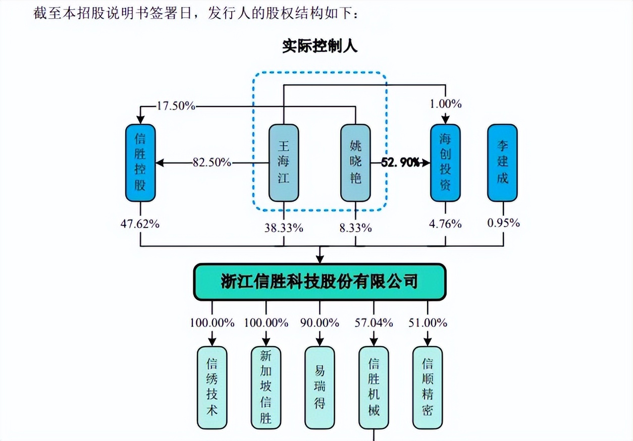 夫妻表决权超99%。信胜科技控股股东是浙江信胜控股有限公司(信胜控股),直接持股比例为47.62%,实际控制人是王海江及姚晓艳夫妇,直接持股比例为46.67%,且通过信胜控股和海创投资控制52.38%的股份,合计控制公司99.05%的股份对应的表决权。