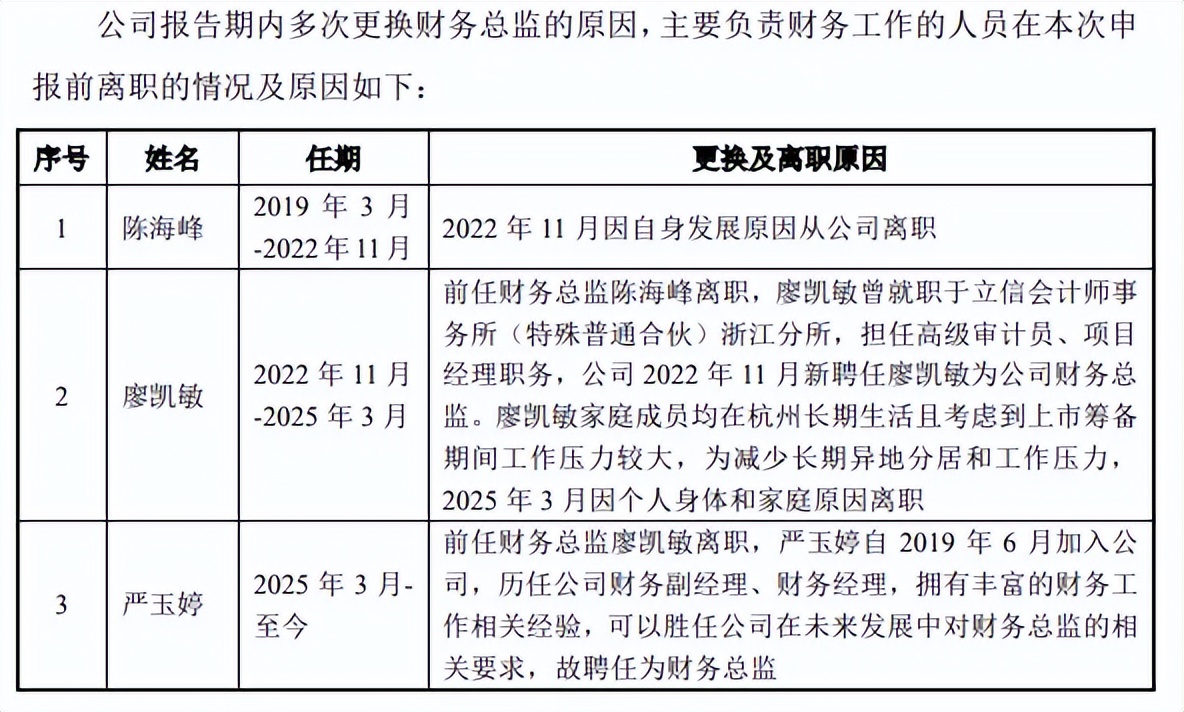 2025年3月,原董事、副总经理、财务总监兼董事会秘书廖凯敏因个人原因离职,公司解释称廖凯敏家庭成员均在杭州长期生活且考虑到上市筹备期间工作压力较大,为减少长期异地分居和工作压力而辞职。