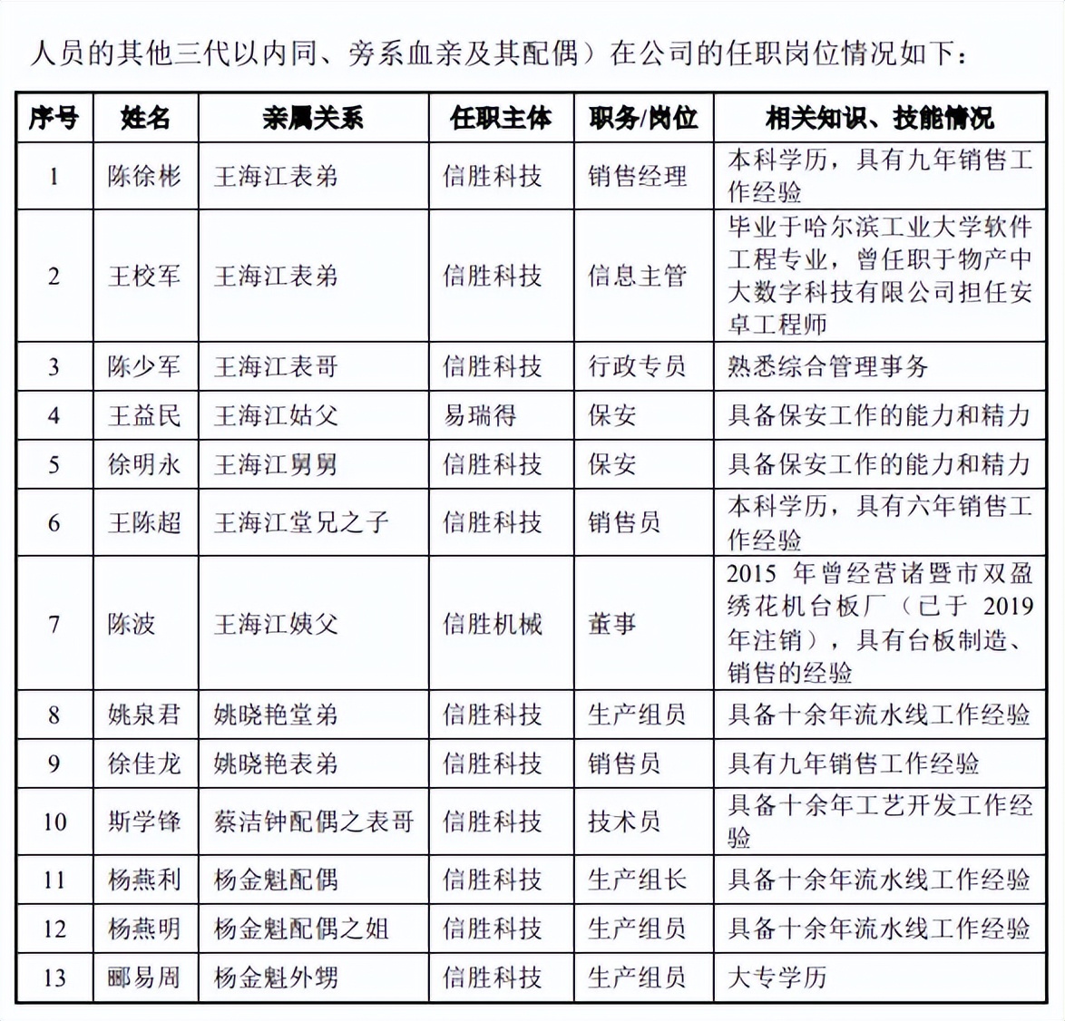 实控人多名亲戚任职公司。王海江表弟陈徐彬、王校军分别担任信胜科技销售经理、信息主管,表哥陈少军是行政专员,舅舅徐明永是保安,姑父王益民是子公司易瑞得保安,姨父陈波是子公司信胜机械董事。