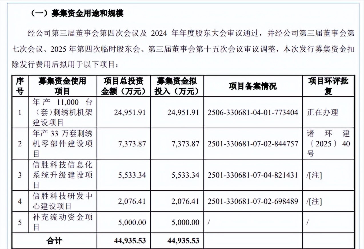 据短平快解读了解,本次IPO,信胜科技拟向不特定合格投资者公开发行股票不超过3,800万股,拟募集资金4.49亿元,用于年产11,000台(套)刺绣机机架建设项目、年产33万套刺绣机零部件建设项目、信息化系统升级建设项目、研发中心建设项目以及补充流动资金,拟投入募集资金分别为2.5亿元、0.74亿元、0.55亿元、0.21亿元以及0.5亿元。