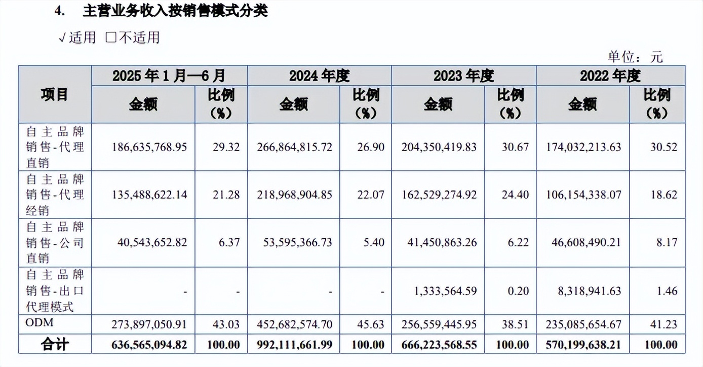 分销售模式来看,期末来自ODM的收入、占比分别为2.74亿元、43.03%,自主品牌销售-代理直销、自主品牌销售-代理经销收入分别为1.87亿元、1.35亿元,占比分别为29.32%、21.28%。