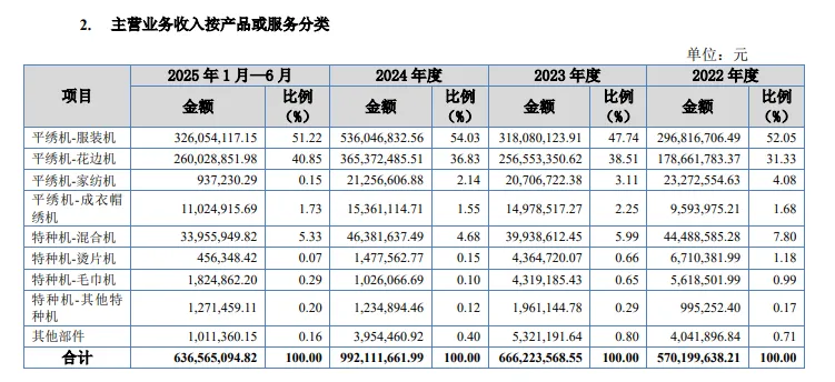 两大产品收入占比超9成,境外收入过半。信胜科技主营业务收入主要由平绣机-服装机、平绣机-花边机贡献,前者报告期实现收入分别为2.97亿元、3.18亿元、5.36亿元、3.26亿元,期末占比51.22%,对应的销售量分别为1,771台、2,009台、3,103台、1,844台。