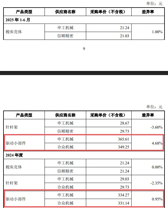 企查查显示,申工机械、合众机械均为高新技术企业、科技中小型企业,2024年参保人数分别为12人、21人,注册资本/实缴资本分别为30万元、500万元,拥有专利分别为10项(均为实用型)、8项(发明1项、实用型7项;原为21项专利,因未缴年费专利权终止),显然后者含金量是要更胜一筹的,但公司向申工机械采购驱动小部件的价格却更高,这是否合理?是否商业逻辑?