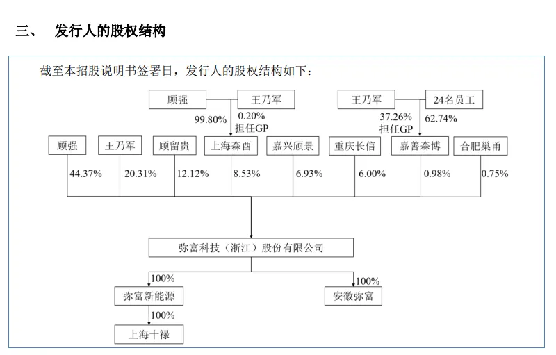 实际控制人表决权超86%。弥富科技控股股东是顾强,实际控制人是顾强、王乃军、顾留贵,持股比例分别为44.37%、20.31%、12.12%,其中王乃军通过嘉善森博、上海森酉分别间接控制0.98%、8.53%的股份,三人合计控制公司86.31%的股份。