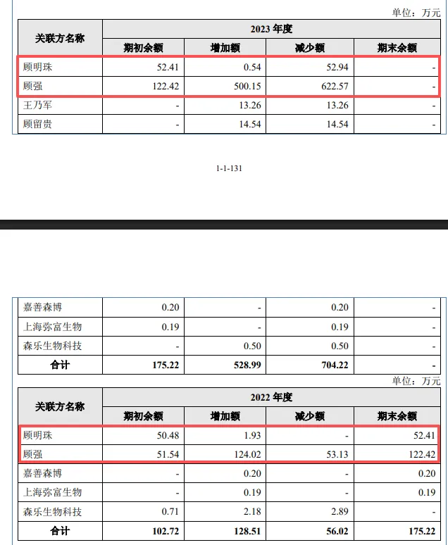 进一步来看,资金拆出对象包括顾明珠、顾强、王乃军、顾留贵、嘉善森博、上海弥富生物以及森乐生物科技,其中顾明珠、顾强是拆借资金重头,2022年初余额分别为50.48万元,当期分别增加1.93万元、124.02万元;2023年初分别为52.41万元、122.42万元,当期分别增加0.54万元、500.15万元。