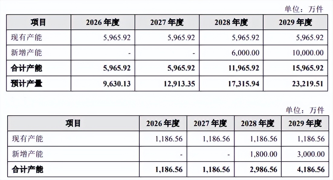 公司传感器2023年度投入量产,产量相对较低,现有产能为1,186.56万件,新增产能是现有产能的2.53倍,属于激进扩产。