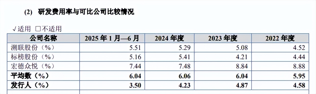 对比行业,可比同行研发费用率均值分别为5.95%、6.04%、6.06%、6.04%,仅高于公司,2024年、2025年1-6月,溯联股份、标榜股份、宏德众悦的研发费用率均超过公司,期末分别为5.51%、5.16%、7.44%。