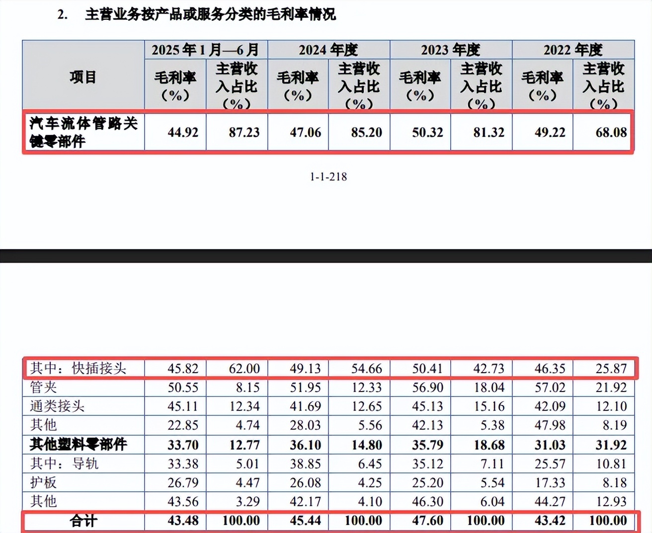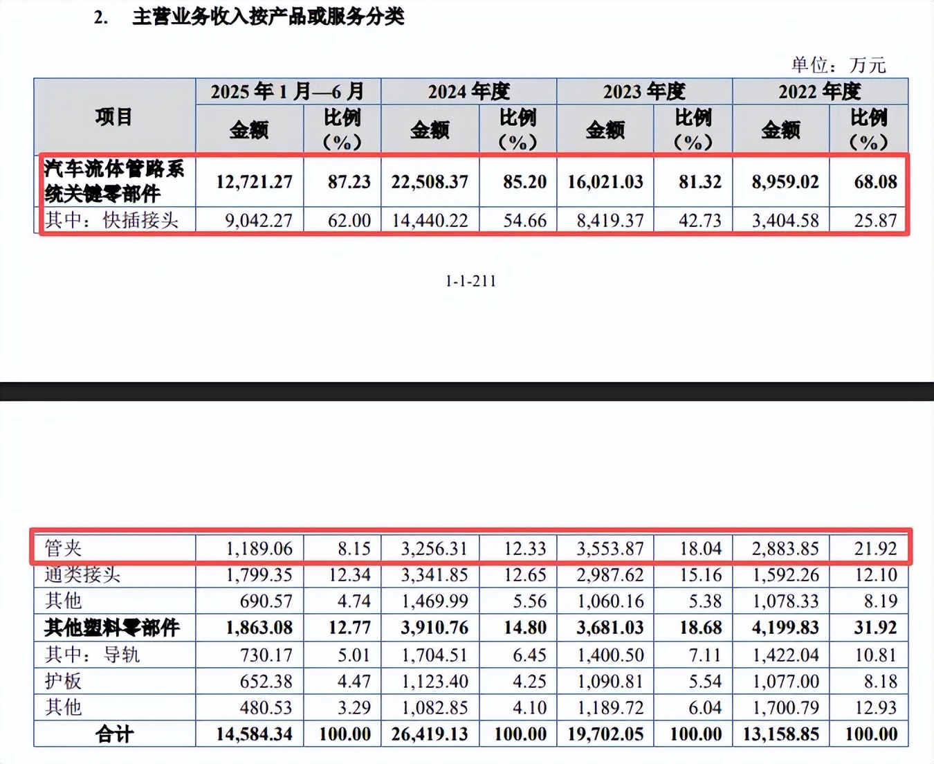 快插接头产品收入占比超六成,毛利率自2023年以来连降。弥富科技主营业务收入主要来源于汽车流体管路系统关键零部件,报告期内实现收入分别为0.9亿元、1.6亿元、2.25亿元、1.27亿元,占比从68.08%上升至87.23%。