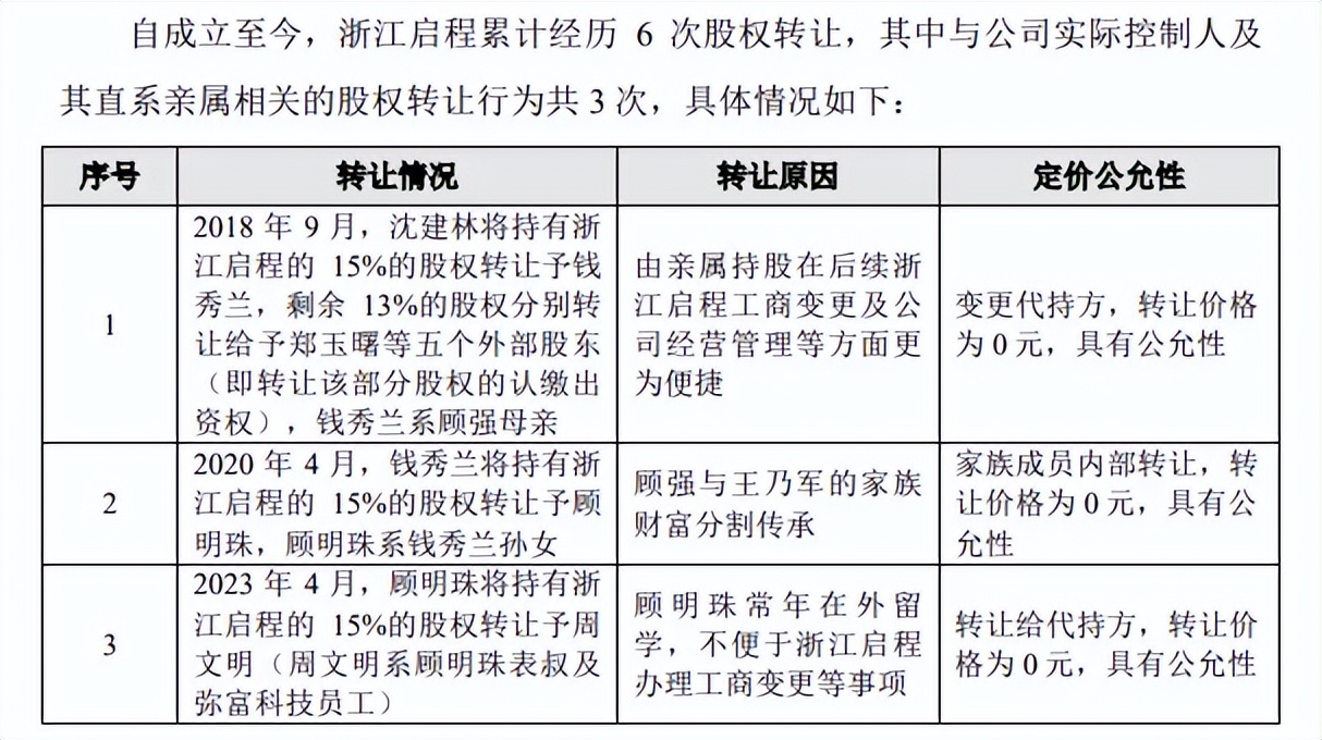 据披露,浙江启程是公司实际控制人顾强及王乃军女儿顾明珠实际持股15.00%的企业,成立之初,顾强曾委托沈建林代持该公司股份,持股比例为28%,2018年9月,沈建林将15%、13%分别转让给钱秀兰(顾强母亲)、以及郑玉曙等五个外部股东;2020年4月,顾强与王乃军离婚,根据双方对于家族财富的分割传承安排,钱秀兰将15%的股权转让予顾明珠;2023年4月,因常年在外留学的原因,顾明珠委托周文明代持15%股份,后者是系顾明珠表叔及弥富科技员工。