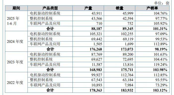 报告期内,电机驱动控制系统产量分别为99,927套、87,769套、105,321套、43,911套,总体存在波动,扩产产能是2024年产能的1.27倍;整机控制系统产量分别为67,543套、69,627套、69,442套、43,566套,2024年同比减少,扩产产能约是当年产能的85%;车联网产品及应用产量分别为10,893套、11,587套、1,505套、710套,2024年大降超万套,扩产产能是当年产能的20.6倍。