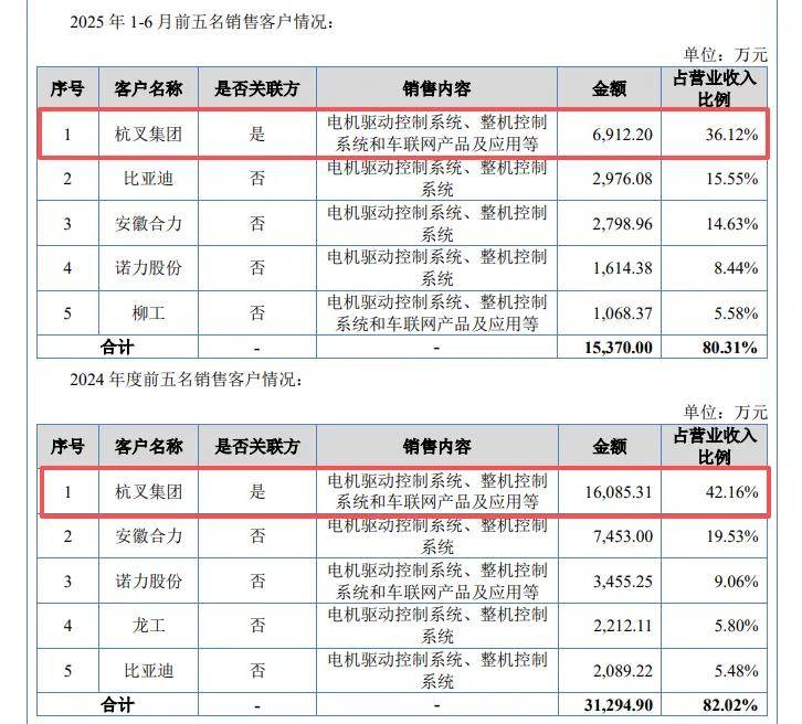 客户集中度高,第一大客户是关联方。报告期内,嘉晨智能对前五大客户的销售额分别为2.93亿元、3.3亿元、3.13亿元、1.54亿元,占比分别为87.05%、87.71%、82.02%、80.31%,客户包括杭叉集团、比亚迪、安徽合力、诺力股份以及柳工,销售内包括电机驱动控制系统、整机控制系统和车联网产品及应用等。