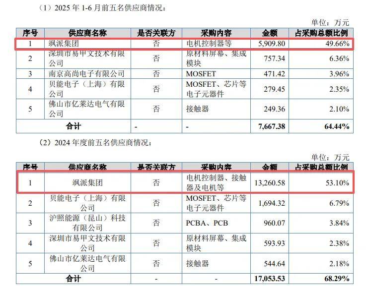 采购主要面向第一大供应商飒派集团,采购额分别为0.93亿元、1.6亿元、1.33亿元、0.59亿元,占比分别为45.94%、69.96%、53.1%、49.66%,采购内容是电机控制器、接触器及电机等。