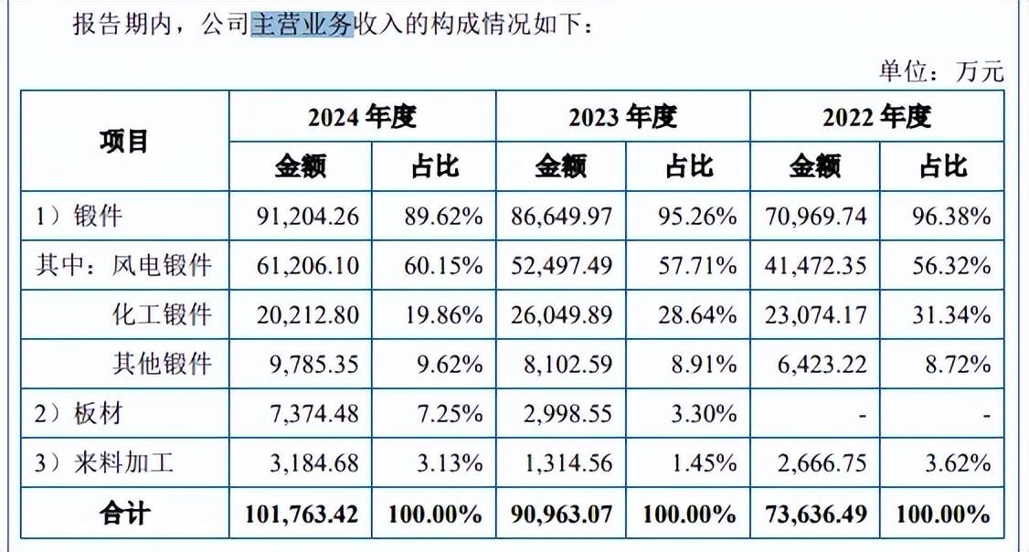 据短平快解读了解,主营业务收入主要来源于锻件,2024年收入、占比分别为9.12亿元、89.62%,其中风电锻件、化工锻件分别为6.12亿元、2.02亿元,占比分别为60.15%、19.86%,即风电行业发展对业绩产生直接影响。