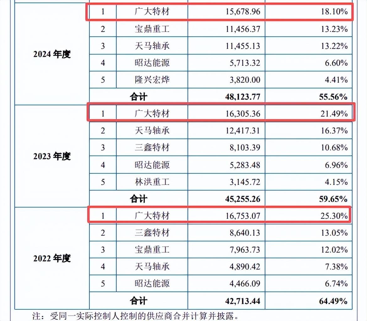 采购额与广大特材销售额存在出入。2022年至2024年,振宏股份向第一大供应商广大特材的采购额分别为16,753.07万元、16,305.36万元、15,678.96万元,采购内容是钢材。