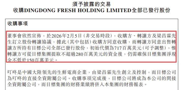 超7亿美元收购案。外卖业务竞争越趋激烈之下,美团进一步发力即时零售,2月5日公告拟以7.17亿元美元(可与调整)代价收购DingdongFreshHoldingLimited(叮咚买菜)全部已发行股份,转让方Dingdong(Cayman)Limited(叮咚)有权在2026年8月31日前,可从叮咚买菜提取不超过2.8亿美元的资金,仍需确保标的公司净现金不低于1.5亿美元。