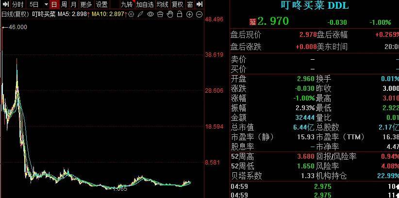 二级市场上,叮咚买菜上市之初股价曾一度飙涨至46美元/股,此后大幅下滑后有所反弹,随后又大幅下滑,低点至1.065美元,截至2月25日收盘,股价为2.97美元,较高点跌幅超9成,总市值6.44亿美元,TTM市盈率16.38倍。