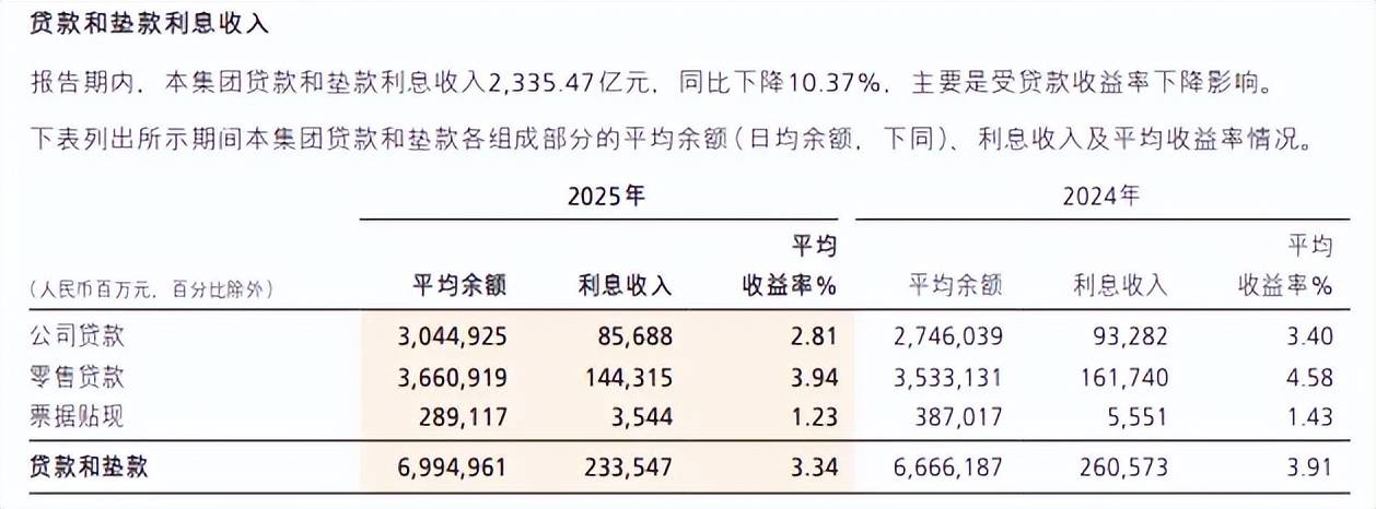 贷款利息收入大降超270亿元。2025年,招商银行贷款和垫款利息收入为2335.47亿元,同比大降270.26亿元,主要受贷款收益率下降影响,当期为3.34%,同比下滑0.57个百分点。