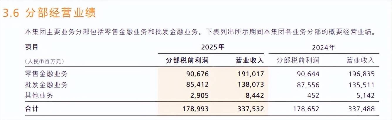 2025年,招商银行实现业绩小幅增长,利息净收入转增是收入扭转下滑的关键,不过非利息收入降幅则进一步扩大;按分部来看,零售金融业务收入出现下滑影响总收入,而批发金融业务收入虽然增长,但利润却有所下滑。