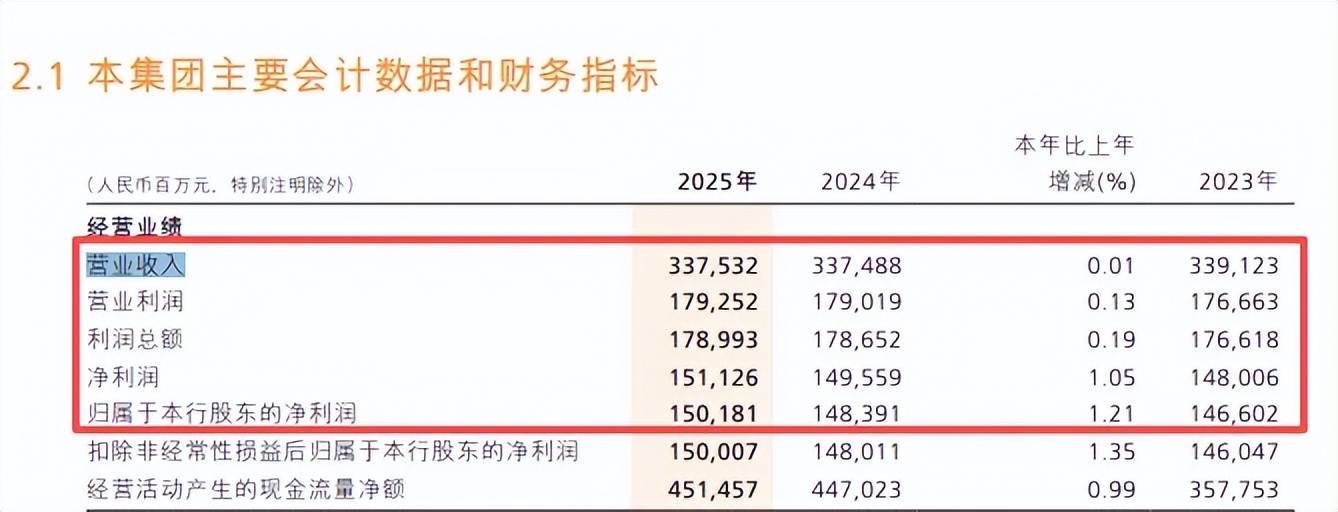 业绩增长瓶颈待破,零售金融业务收入大降。2023年至2025年,招商银行实现营业收入分别为3391.23亿元、3374.88亿元、3375.32亿元,前两年分别下滑1.64%、0.48%,去年同比微增0.01%;归母净利润分别为1466.02亿元、1483.91亿元、1501.81亿元,同比增速分别为6.22%、1.22%、1.21%。