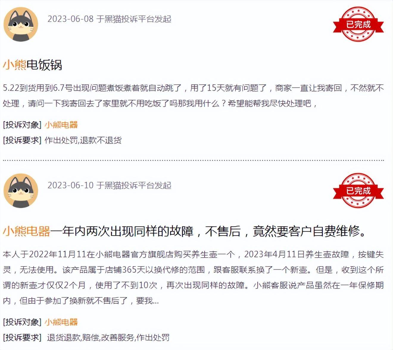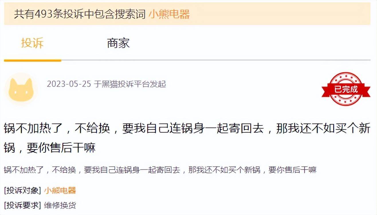 例如,黑猫投诉平台上,截至6月底,记录有关小熊电器的投诉达493条。