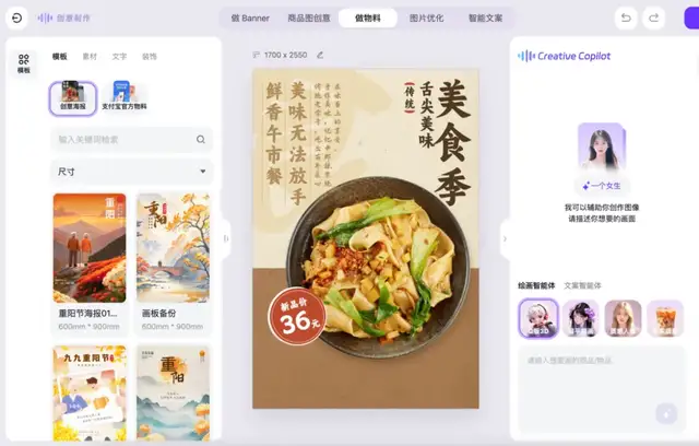 “蚂上有创意”正尝试解决这个场景下的痛点——商家登陆网站(idesign.alipay.com)并申请使用后,就可选择合适模板、编辑图片与文案、或是告诉AI助手自己的个性化需求,只要几个步骤就能做好一张海报。