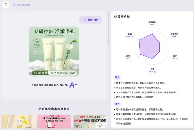 支付宝的“蚂上有创意”同样提供了AI创意洞察的智能服务。在这个环节中,AI化身成为一位专业的营销顾问,对物料进行分析评估,在涉及素材视觉吸引力、文案感染力、与目标受众的匹配度等环节,大模型都能精准地给出具有针对性的优化建议。