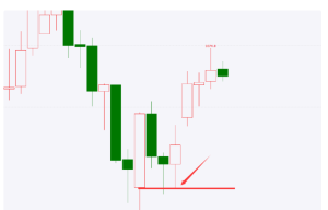 上图所示是一段行情的底部位置,如果参考底部K线的开盘价位置在行情出现回抽的时候顺势买入此时就可以把止损点设置在最低价位置那么此时的买点相对就会比较低,就算行情反向走,此时承受的止损点也是自己能够承受的;