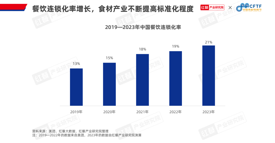 近年来,我国餐饮的连锁化程度也在不断提高。据红餐产业研究院测算,2023年我国餐饮连锁化率达到了21%,同比提高了2个百分点。餐饮连锁化程度的提升,拼的是背后食材供应链的实力。餐饮行业的发展,很大程度上推动了餐饮食材产业的进一步发展。