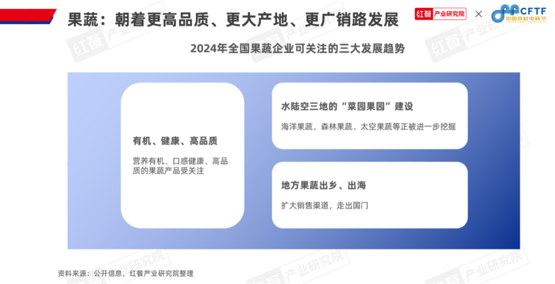 红餐产业研究院与良之隆·中国食材电商节梳理了果蔬可关注的三大趋势:有机、健康、高品质;水陆空三地的“菜园果园”建设;地方果蔬出乡、出海。