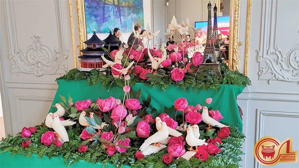 在晚会上,餐桌设计和花卉装点成为一大亮点,中国名厨专门为当晚创作了纪念中法建交60周年的主题蔬菜雕刻花艺展台,艾菲尔铁塔和天坛造型在萝卜雕刻的和平鸽、牡丹花丛簇拥下营造了浓浓的喜庆和友好气氛。嘉宾们认为整体布局体现了中西合璧、美食交融的特色。巴黎中国文化中心的音乐团队还为嘉宾们演奏了太湖美、紫竹调、江南好、茉莉花等脍炙人口的中国丝竹乐名曲,伴随着名菜佳肴的逐道呈现,嘉宾们在美好的氛围中谈兴渐浓。中法建交60周年、中法文化旅游年的众多项目都是当晚嘉宾热议的话题。从在巴黎凡尔赛宫皇家歌剧院举行的“庆祝中法建交60周年暨中法文化旅游年开幕音乐会”谈到在巴黎中国文化中心举办的“丝路瓷行——中国景德镇陶瓷文化特展”,从“中法文化之春”说到“第37届贝尔克国际风筝节中国主宾国活动”和即将开幕的“第十届法国中国电影节”等,中法嘉宾们彼此尊重并深度交流,美食之夜成为一个思想碰撞、相互交融的重要平台。