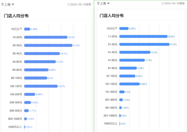 而截至2024年4月19日,人均客单价在500元以上的餐饮店占比大缩水,从原本的1.44%降低至0.8%,总门店数减少了900多家。