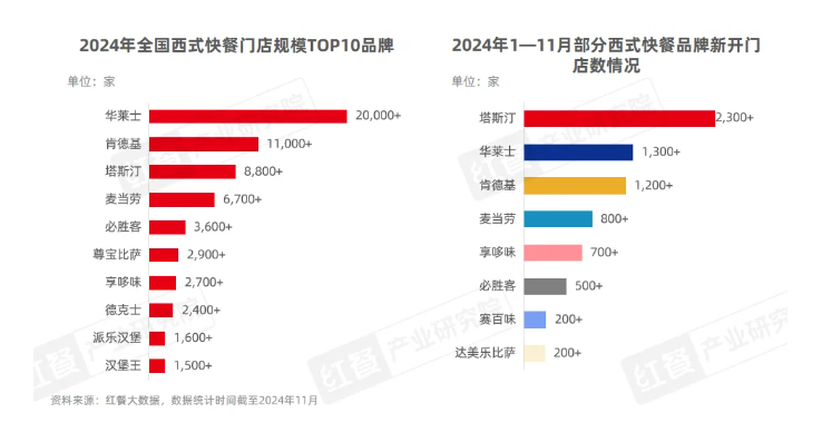 比如华莱士,截至今年11月,华莱士全国门店数超过2万家;肯德基门店数则超过11000家;而塔斯汀的门店数,对比2023年底更是新增2000余家,目前总门店数已超8800家;麦当劳前三财季则开出640家门店,加快了拓店速度,目前门店数也已超6700家。