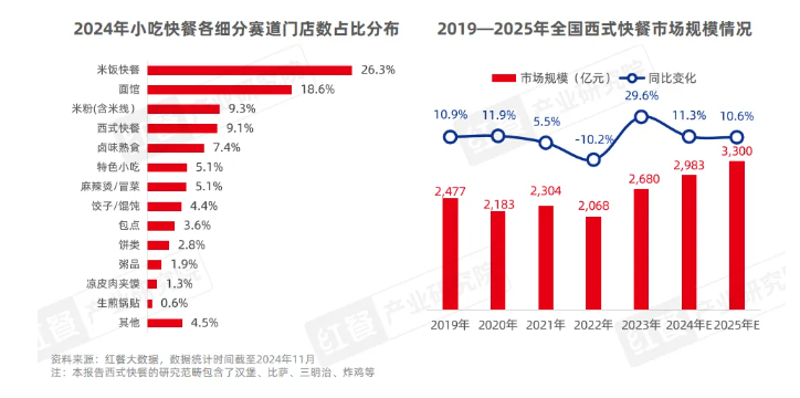 据红餐产业研究院预测,2024年全国西式快餐市场规模将达到2983亿元,同比增长11.3%。红餐大数据显示,西式快餐的门店数占比在小吃快餐赛道中排第四位,占比为9.1%。