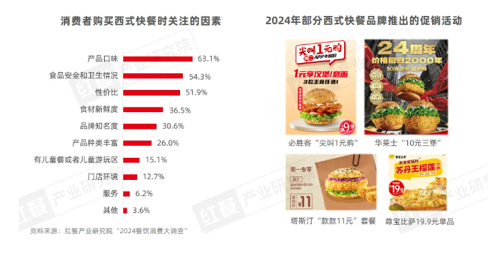 红餐产业研究院“2024餐饮消费大调查”显示,消费者在购买西式快餐时最关注的前三个因素分别是产品口味、食品安全和卫生情况、性价比,占比分别为63.1%、54.3%和51.3%。