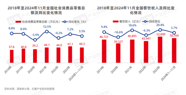国家统计局数据显示,2024年1—11月,全国社会消费品零售总额为44.3万亿元,同比增长3.5%;2024年1—11月,我国餐饮收入为5.02万亿元,同比增长5.7%。从数据来看,2024年的餐饮大盘总体是在增长的,但是与往年相比,增速却有所放缓。
