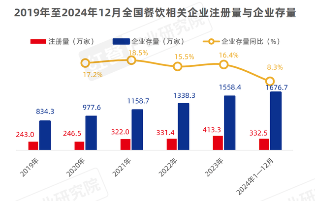 与此同时,2024年餐饮行业入局者数量创下了近年的新高。2024年1—12月,全国餐饮相关企业注册量超330万家,企业存量达到了1676.7万家,已大幅度领先2023全年的1558.4万家。大量创业者的涌入,也加剧了餐饮行业的竞争,各赛道空前内卷。