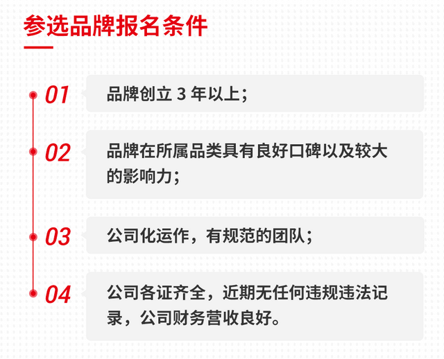 目前,评选活动正处于海选阶段,我们已收到许多餐饮行业各细分品类的优质品牌的报名。评选报名截止时间延长至2025年1月15日,欢迎有意向参与品类十大品牌评选的优质餐饮品牌抓紧时间报名!凡是符合以下条件的品牌均可报名参选。
