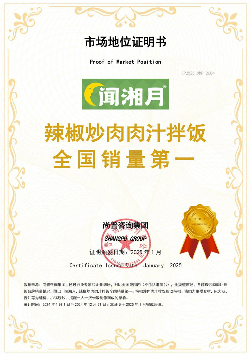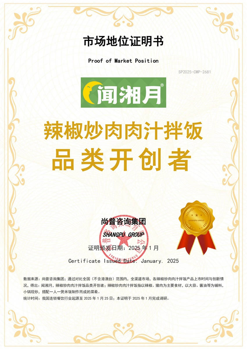2025年1月,尚普咨询集团向闻湘月颁发市场地位证明书。此次闻湘月荣获尚普咨询【闻湘月,辣椒炒肉肉汁拌饭品类开创者】及【闻湘月,辣椒炒肉肉汁拌饭全国销量第一】市场地位证明,标志着闻湘月在我国餐饮行业中的卓越地位及市场的高度认可。