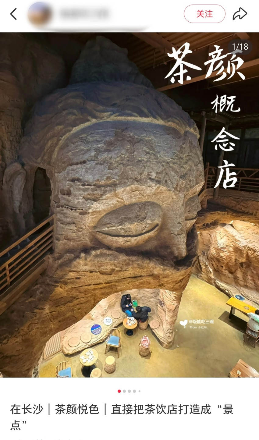 此前,茶颜悦色也将其位于长沙的多个概念店打造成“景点式”门店,据不完全统计,“茶颜悦色旗舰店”在小红书的相关笔记高达3000多条,而几乎每家店都被网友奉为“打卡圣地”。尤其是其开在步步高星城天地商场的楼兰店,店内以石窟风格为特色,标志性的大头佛像尽显古朴厚重,一楼的茶颜子品牌小神闲茶馆还设有小阅读区,免费提供书籍。