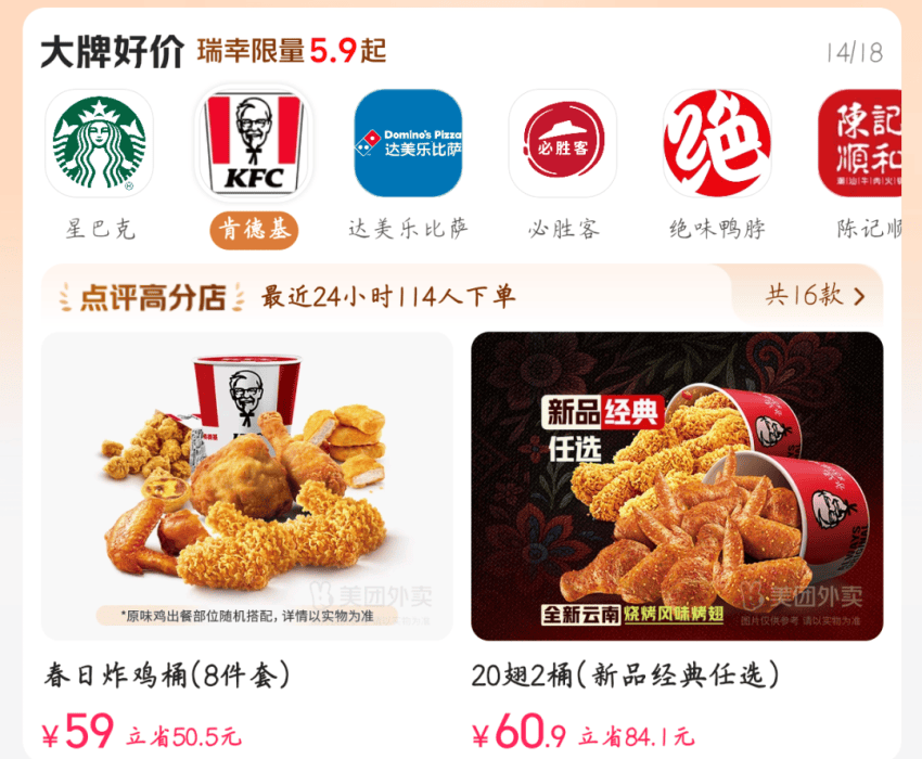 比如,神抢手“大牌好价”专区,对瑞幸咖啡、霸王茶姬、肯德基等大牌的产品进行滚动展示。神抢手为这些优质品牌商家新增了更多展示标签,比如点评高分店、甄选好店、必点榜、中华老字号、点评人气店等。