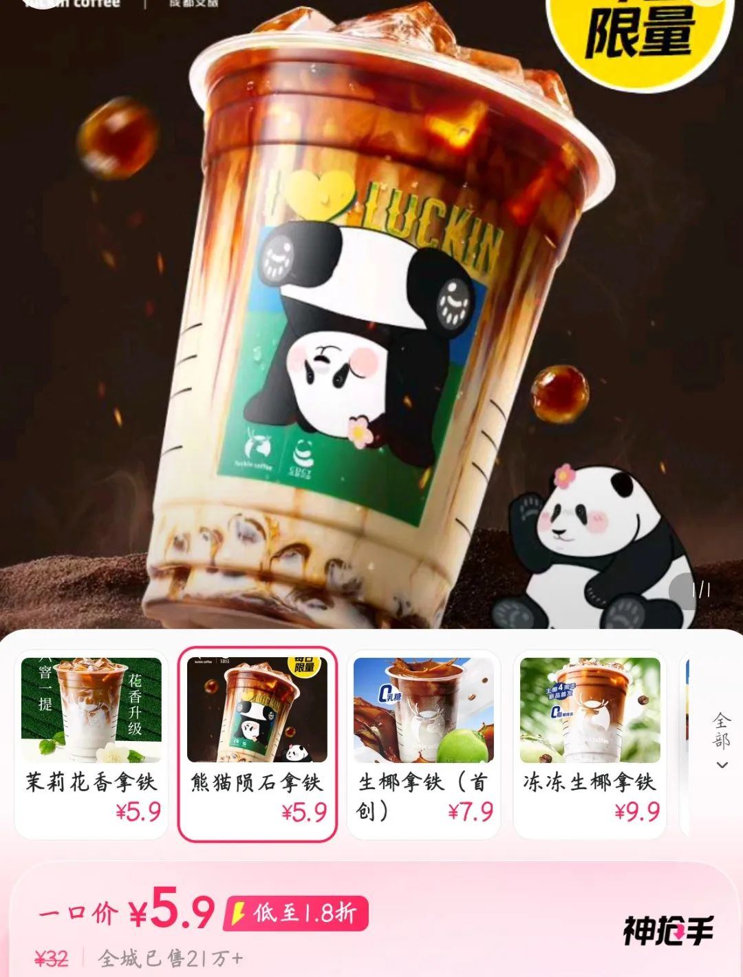 红餐网注意到,“大牌好价”专区的多款产品销量表现亮眼,像瑞幸咖啡的5.9元熊猫陨石拿铁在广州已经售出21万+杯,麦当劳的多款套餐销量达到5万+。