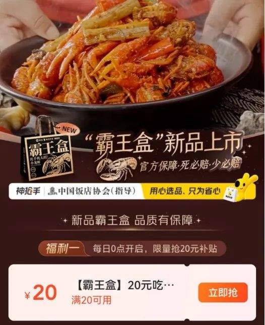 今年5月,“神抢手”联合肥肥虾庄、靓靓蒸虾、巴厘龙虾、聚味瞿记等武汉、长沙的知名小龙虾品牌,推出“霸王盒”一人食外卖套餐等,强调“鲜虾、大虾”,并承诺“活虾现做、死虾必赔”。